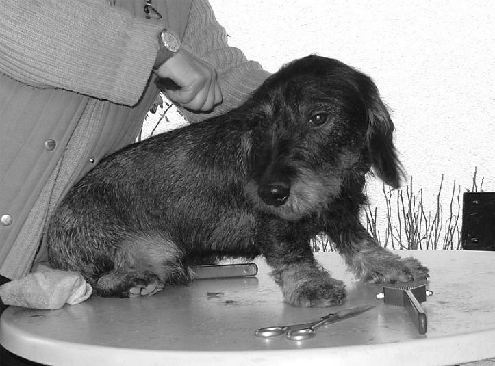 Schon vor seinem Auftritt erntet er großes Lob: "So ein schöner braver Kerle!" Eine hilfsbereite Dame, die einen Verkaufsstand mit allerlei nützlichem Hunde- und Hundebesitzer-Zubehör aufgebaut hat, verpasst Axel noch den letzten Schliff. Mit einem Spezialkamm wird abgestorbene Unterwolle am Rücken entfernt und zu weit überstehende Haare an Ohren, Bart und Beinen werden gestutzt.