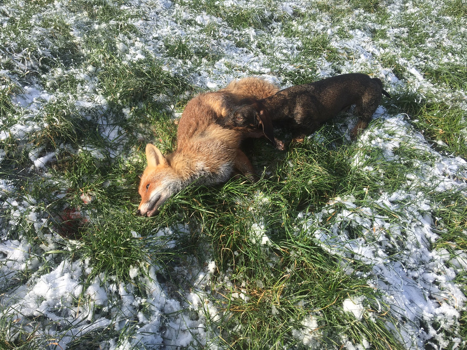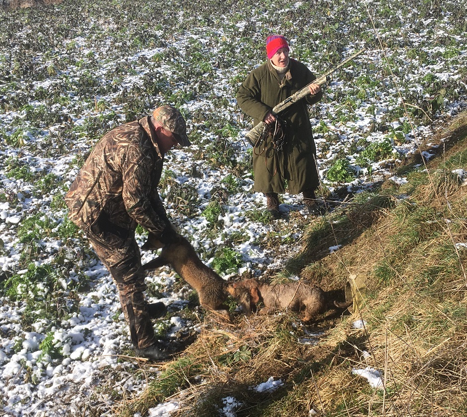 Als nächstes wieder ein Kunstbau auch in Hailtingen. Beim Hinlaufen meinte Stephan: „Da war noch nie ein Fuchs drin.“ Stephan war bestimmt schon 10-mal in der Umgebung von Uttenweiler zur BauN. Doch dieses Mal steckt der Fuchs in dem Y-Bau. Umami der Gabi Niess gibt laut. Dann kein Bellen mehr, der Hund muss gefasst haben. 10 Minuten später äugt der Fuchs aus dem Loch, kann nicht Springen. Stephan hat den Fuchs erlegt und dann Fuchs mit Dackel aus der Röhre gezogen. Der Dackel hing an der Lunte und hat das Springen verhindert.