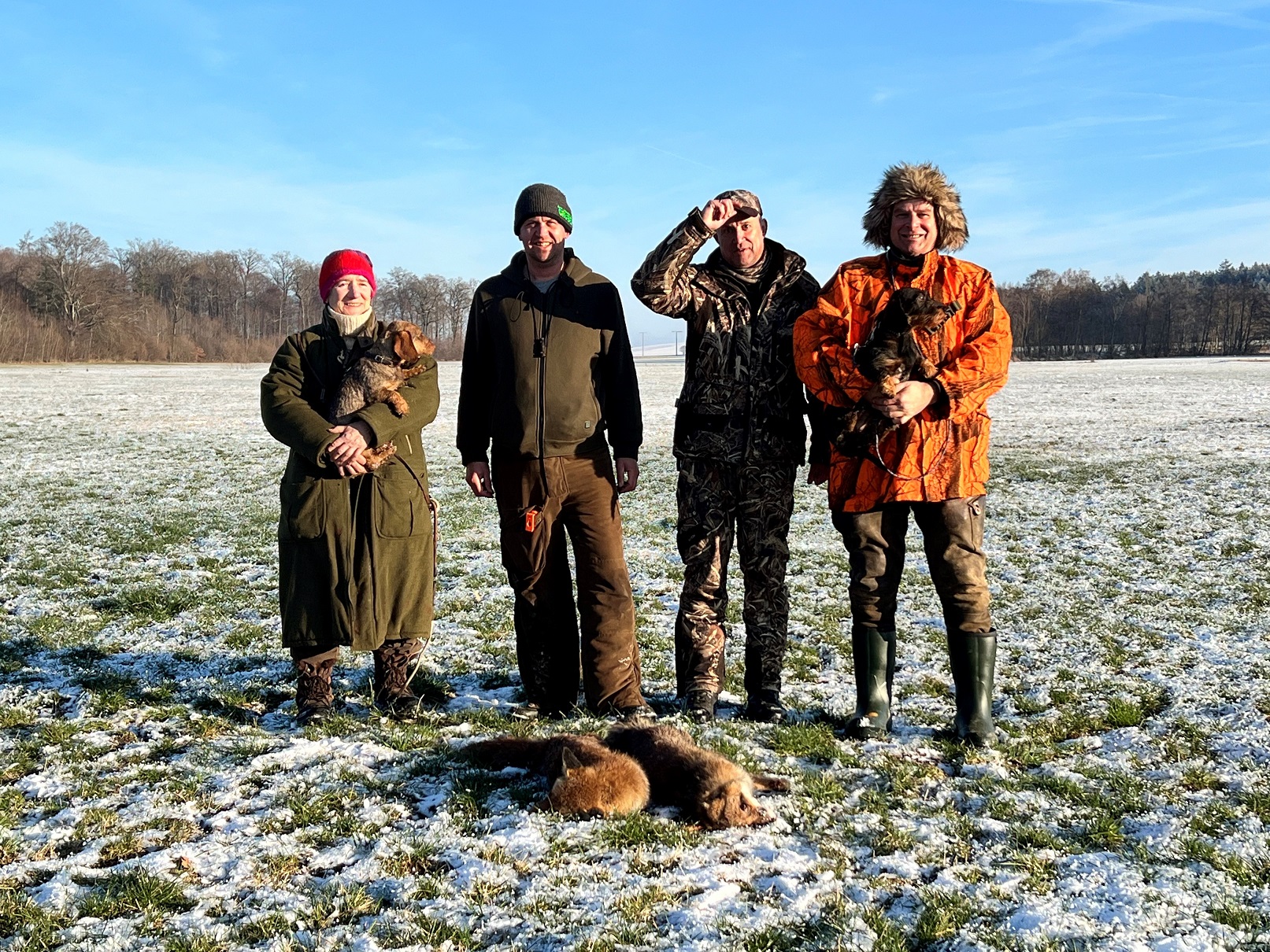 Um 9:00 trafen sich 1 Hundeführer und 2 Führerinnen mit 4 Dackeln sowie Stephan Fauser als Richter und Michel Kurz als Anwärter bei herrlichem kaltem Wetter zur Baujagd. Nach einer kurzen Sicherheitsbelehrung ging es sofort los. Alle Bauten waren kontrolliert und gut befahren. 4 Kunstbauten und einer Dohle weiter, Ernüchterung kein Fuchs war zu Hause. Das Wetter war einfach zu schön. Die Führer wechselten von Bau zu Bau durch.