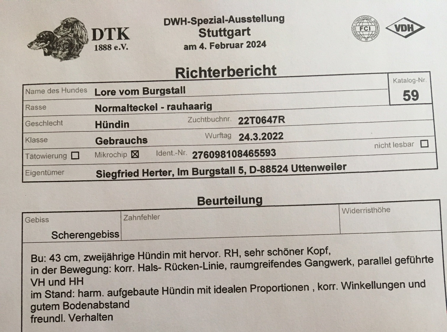 Ausstellung ist zwar nicht unsere Welt. Trotzdem war der Sonntag für unsere Lore sehr erfolgreich. Mit einem Vorzüglich und einer Reserveanwartschaft CAC(VDH) sind wir mehr als zufrieden. Die Beurteilung von Richtern Nicole Kubil aus der Schweiz: