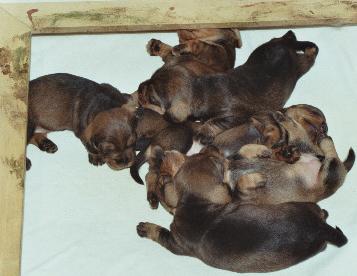 28.4.08 Die Kleinen sind alle kerngesund. Am Wochenende war großes Welpengucken angesagt. Opas, Omas, Kinder und etliche Interessenten. Habe die Welpen heute auch das 2. mal entwurmt. Die Kleinen fressen jetzt schon nett zu. Am Samstag mussten sie alle in den Zwinger umziehen. Am Samstag Morgen war das ganze Wohnzimmer voll Würstchen und es hat erbärmlich gestunken. Die Sauerei kann ich meiner Frau nicht mehr zumuten.