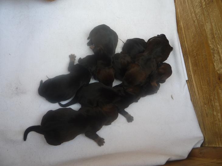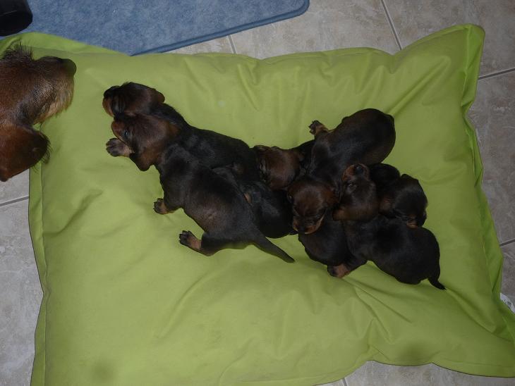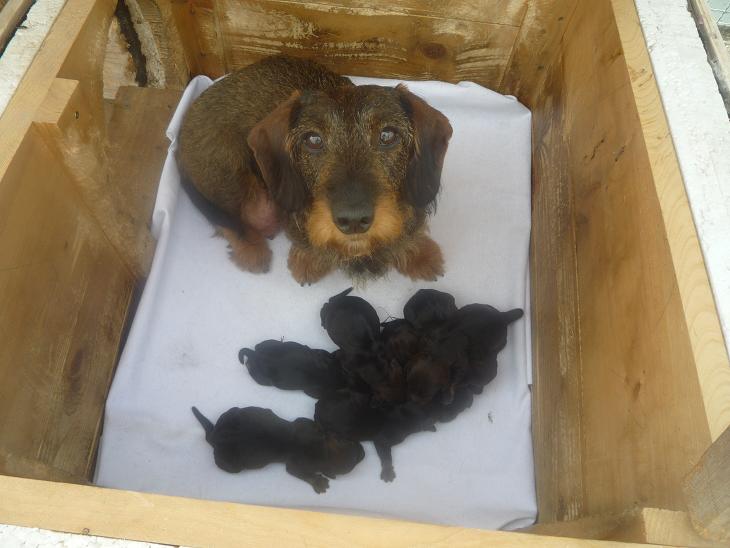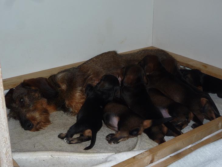 Am 14.6.2012 hat die Donna 7 Welpen gewölft. Es sind 3 Rüden und 4 Hündinnen. Am Tag vorher habe ich im Wohnzimmer die Wurfkiste aufgebaut. Diese hat sie auch am Abend sofort angenommen. Über Nacht war sie aber nochmals im Zwinger, da ja noch ein paar Tage Zeit waren. Morgen's ging ich mit allen 3 Hunden in den Wald. Die Donna war etwas kurzatmig. Das war sie aber schon die letzten Tage. Sie war auch kugelrund. Am Nachmittag kam ich in den Garten. Als ich im Zwinger nur die Bella zu Gesicht bekam, und diese sehr aufgeregt war, habe ich in die Hundehütte geschaut. Und da war die Donna mit 6 putzmunteren Welpen. Alle feucht, also kamen sie erst kurz vorher zur Welt. Ich hatte die Wurfkiste also umsonst aufgebaut. Die Donna wollte ihre Kleinen lieber im Zwinger zur Welt bringen. Da es nicht kalt ist, habe ich sie draußen gelassen. Die Bella musste dann in den neuen Zwinger umziehen. Als Kinder zum gassigehen kamen, kam die Donna sogar aus dem Zwinger, da habe ich gedacht sie ist fertig. Beim Abtasten habe ich aber noch etwas gefühlt. Und tatsächlich kam 2 Stunden später noch ein Rüde.
