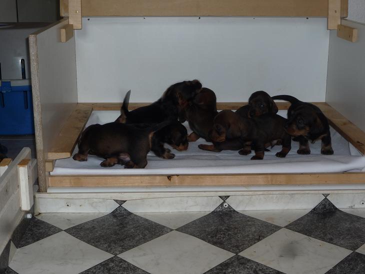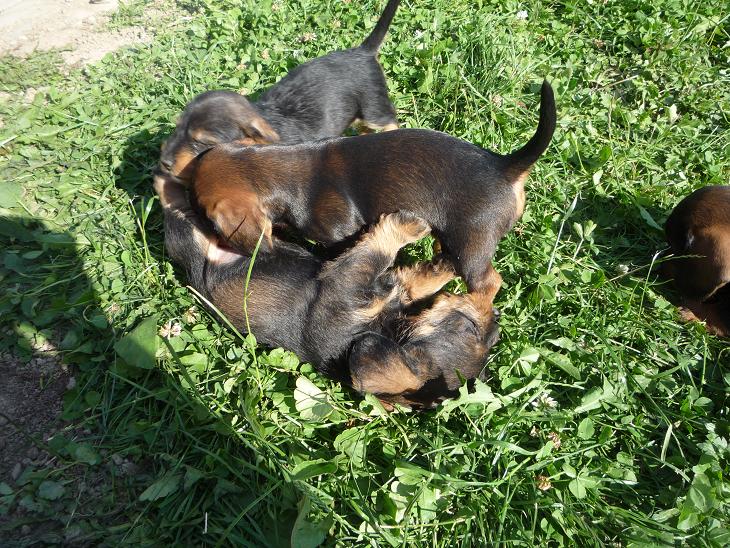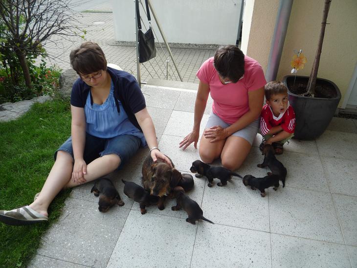 25.7.2012 Die Welpen entwickeln sich zu richtigen Rabauken. Auch der "kleine Egon" (der oberste im Bild unten) ist inzwischen ein richtiger Kämpfer. Die Kleinen fressen schon jede Menge Welpenfutter. Ich schätze, dass die Donna so langsam mit dem abstillen beginnt. Die Donna ist auch nicht mehr immer im Zwinger, denn die Kleinen lassen ihr so gut wie keine Ruhe. Ich glaube der Rattenfänger von Hameln war in Wirklichkeit ein Dackelzüchter mit einem Wurf Welpen. Die Welpen ziehen die Kinder magisch an. Für die Eltern ist das praktisch, denn sie wissen die Kinder sind bei Herter's im Burgstall zu finden. Am Freitag war ein Welpenkäufer da, er kam anfangs gar nicht zu den Welpen durch weil 6 Kleinkinder im Zwinger gesessen sind. Unten sind unsere Dauergäste zu sehen. Die Mädchen sind schon größer und man kann sie auch einmal mit den Welpen alleine lassen. Ich habe eine interessante Entdeckung gemacht. Die Welpen mit kurzem Haar haben die Zähne zuerst bekommen. Je länger das Haar wurde umso später kamen bzw. kommen die Zähne. Scheinbar wird die aufgenommene Energie zuerst für die Haare und dann für die Zähne verwendet. Bei der zweiten Entwurmung war kein Befall vorhanden.
