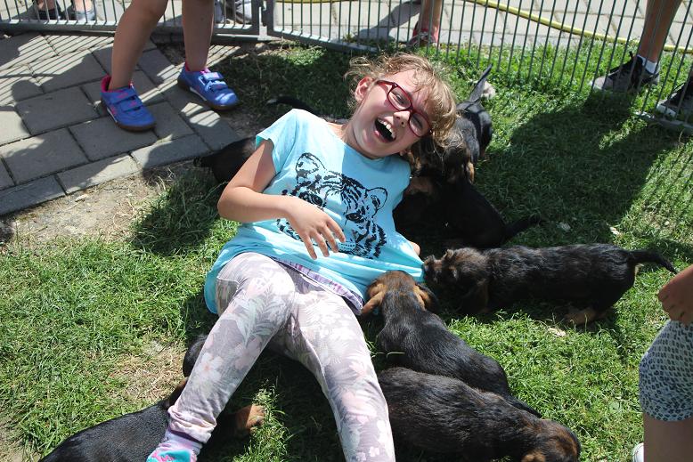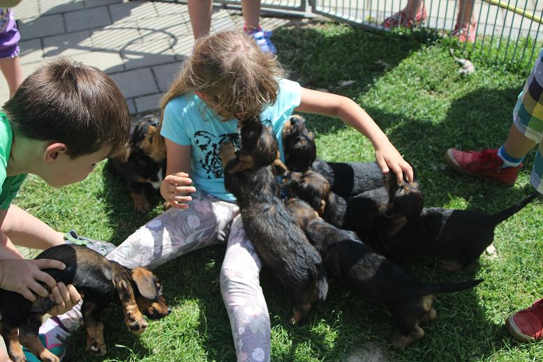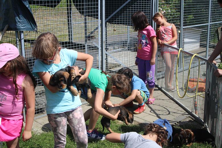 7.7.2016 Heute war Wurfabnahme. Wie schon vermutet haben 3 Welpen zuviel weiß und es wird eine Zuchtbeobachtung eingetragen. Ein Rüde hat einen kleinen Nabelbruch, der laut Tierärztin aber nicht operiert werden muss, da er sich wahrscheinlich verwächst. Es wurden keine Gebiss, Ruten oder Hodenfehler festgestellt. Donna hatte wieder einen tollen letzten Wurf. Die ersten Welpen können nun abgegeben werden. Am Nachmittag war die Kinderbetreuung der Grundschule aus Uttenweiler zu Besuch. Bilder sprechen mehr als tausend Worte!