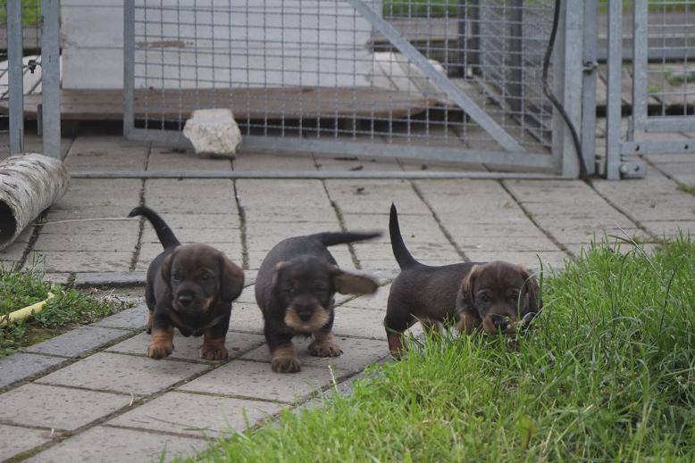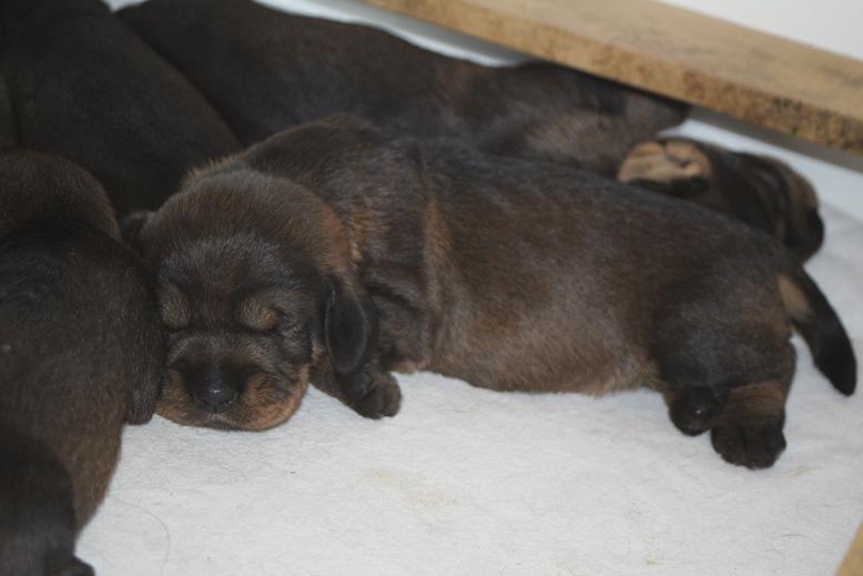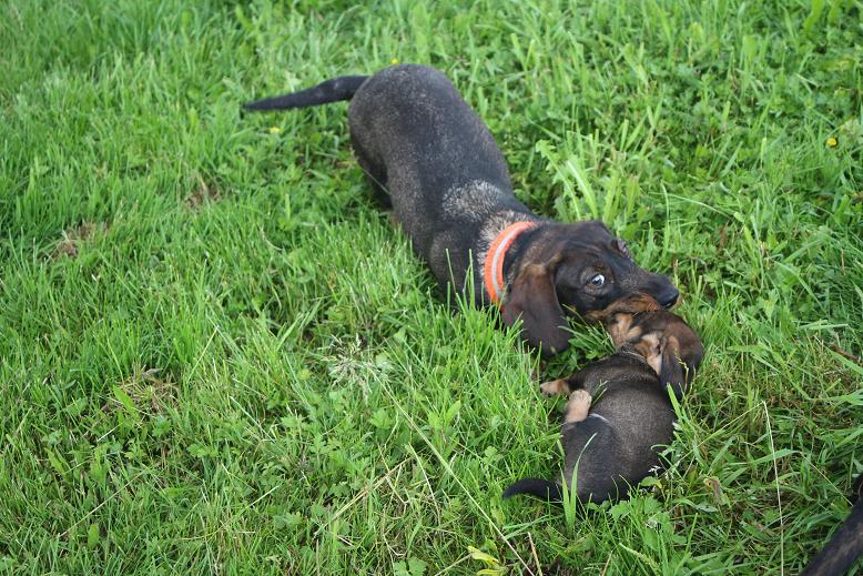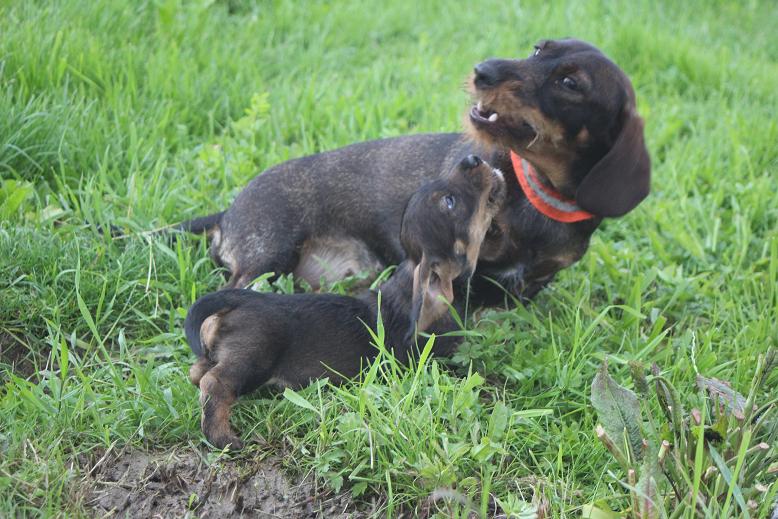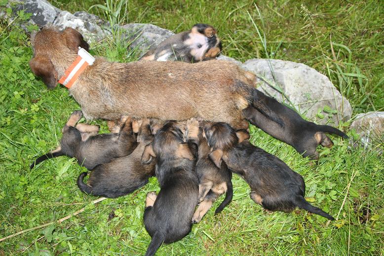 30.5.2016 Die Welpen stehen jetzt auf den eigenen Füßen. Sie verrichten jetzt auch ihr Geschäft selbständig. Bisher ist der Wurf sehr ausgeglichen, abgesehen von den weißen Flecken auf der Brust. Die erste Entwurmung hat auch statt gefunden. Der Donna ist es schon wieder langweilig und lässt die Welpen schon mal 2 Stunden alleine. Heute ist sie beim Gassi gehen, dem Danny hinterher. Der hat die Dachse in ihrem Bau kontrolliert.