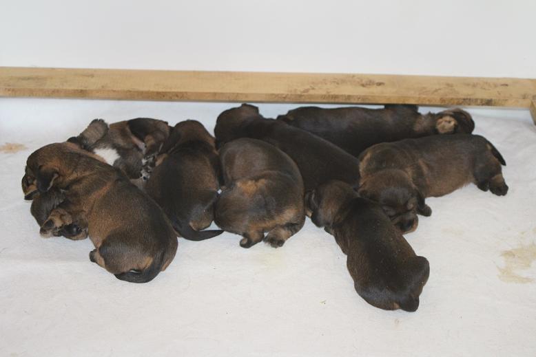 9.5.2016 Die Welpen kamen etwas zu früh zur Welt. Das ist nicht verwunderlich bei wieder 9 Stück. Wir sind extra nicht zum Nachdecken gegangen in der Hoffnung, dass es nicht so viele geben soll. Scheinbar hatten wir den idealen Deckzeitpunkt gewählt. Was kein Problem ist, da ist der Danny ein sehr zuverlässiger Indikator. Freitag Abend ging unsere Tochter mit Danny und Goldie Gassi. Anschließend ist sie mit der Donna gegangen, die keine so großen Runden mehr geschafft hat. Unsere Tochter meinte: "Papa du musst die Wurfkiste aufbauen, der Danny geht der Donna aus dem Weg, und die Goldie ist ganz aufgeregt." Nachts um 1:30 Uhr hat mich dann unsere andere Tochter geweckt: "Die Donna bellt!" Ich habe mich dann neben Donna auf das Sofa gelegt, sie hat sich dann auch sofort beruhigt. Donna braucht bei der Geburt keine Hilfe, aber sie möchte zumindest bis zur Geburt der ersten Welpen nicht alleine sein. Morgens um 6:30 Uhr bin ich am Fiepen des ersten Welpen erwacht. Nachmittags zum Kaffe waren es 6 und wir dachten sie sei fertig. Bis 22:30 Uhr kamen aber nochmals 3 hinzu. 2 Hündinnen sind sehr klein, sie hatten eine Geburtsgewicht von nur 150 Gramm. Der schwerste Rüde wog 245 Gramm. Beim Wurf aus dem Jahr 2013 waren aber auch so kleine Welpen dabei. Wir haben wieder Welpen mit weißer Brust, und sind also, wie letztes Jahr, "Piebaldzüchter".