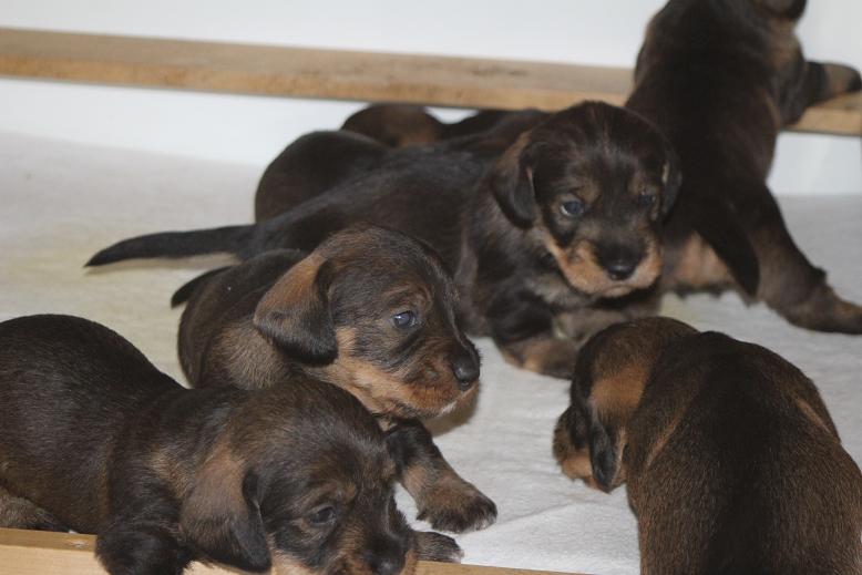 27.6.2015 Nachdem ein Käufer aus "gesundheitlichen Gründen" abgesprungen ist, ist wieder ein Rüde zu haben. Die Donna ist von den Welpen ausgezogen. Sie lässt sie nur noch gelegentlich trinken. Bei der letzten Entwurmung war wieder ein leichter Befall von Spulwürmern festzustellen. Donna hatte nun ja schon ein paar Würfe und gibt immer noch Larven weiter. Die Natur verwundert uns immer wieder. Das Gesäuge bildet sich bei der Donna zurück. Sie ist schon wieder richtig gut in Form. Am Samstag vor einer Woche hat sie einen Fuchs, beim Gassi gehen, erledigt. Der hat sich unter einer Dornenhecke gestellt. Er hätte eigentlich problemlos flüchten können. Als der Danny da zu kam und den Fuchs hinten an der Lunte gehalten hat, hat Donna kurzen Prozess gemacht. Ich hatte kurze Hosen an, und konnte nicht in die Hecke eindringen. Bisher wurden folgende Namen ausgesucht: Hustav (Gustav), Hannibal, HALF, Holly, Hexe. Am Samstag war Goldies Schwester Gretel mal wieder bei den Welpen. Sie war mit den lebhaften Welpen kurz überfordert. Gretel hat sich aber schnell gefangen. Sie geht aber nicht so streng wie die Goldie mit den Kleinen um. Auch die Gretel durfte von Anfang an zu den Welpen. Die Donna kennt ihre Familie genau. Wir hatten einen zugekauften Hund namens Bella. Die durfte nicht einmal in die Nähe von Donnas Welpen, als diese noch klein waren. Der Danny macht einen großen Bogen um die kleinen Wirbelwinde. Der ist ein alter Grießkram gegenüber den Kleinen. Drei Welpen haben kürzeres der Rest längeres Haar mit schon herrlichem Bart.
