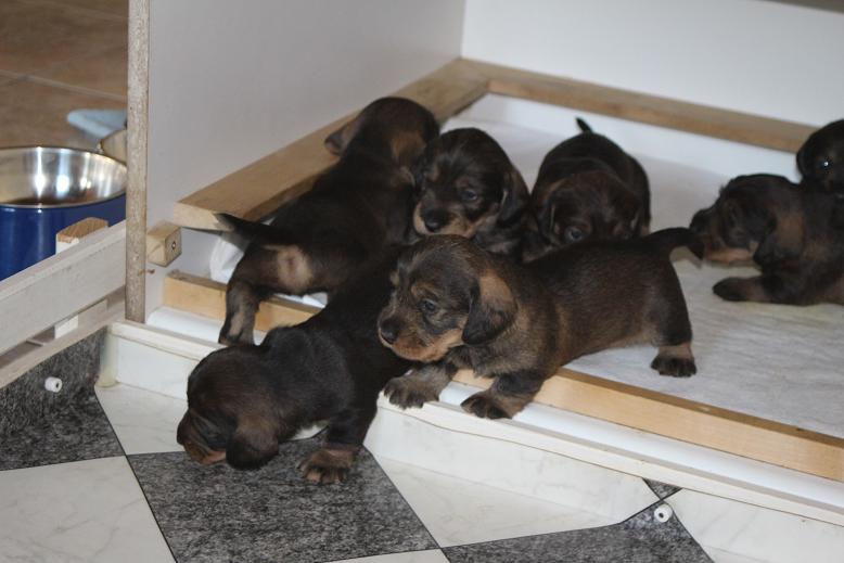 7.6.2016 Die Welpen sind vom Wohnzimmer in den Zwinger umgezogen. Wir kamen mit dem Putzen und Lüften nicht mehr hinterher. Im Zwinger ist das einfacher, der wird einfach rausgespritzt. Die Welpen fressen schon ein wenig Welpenfutter.